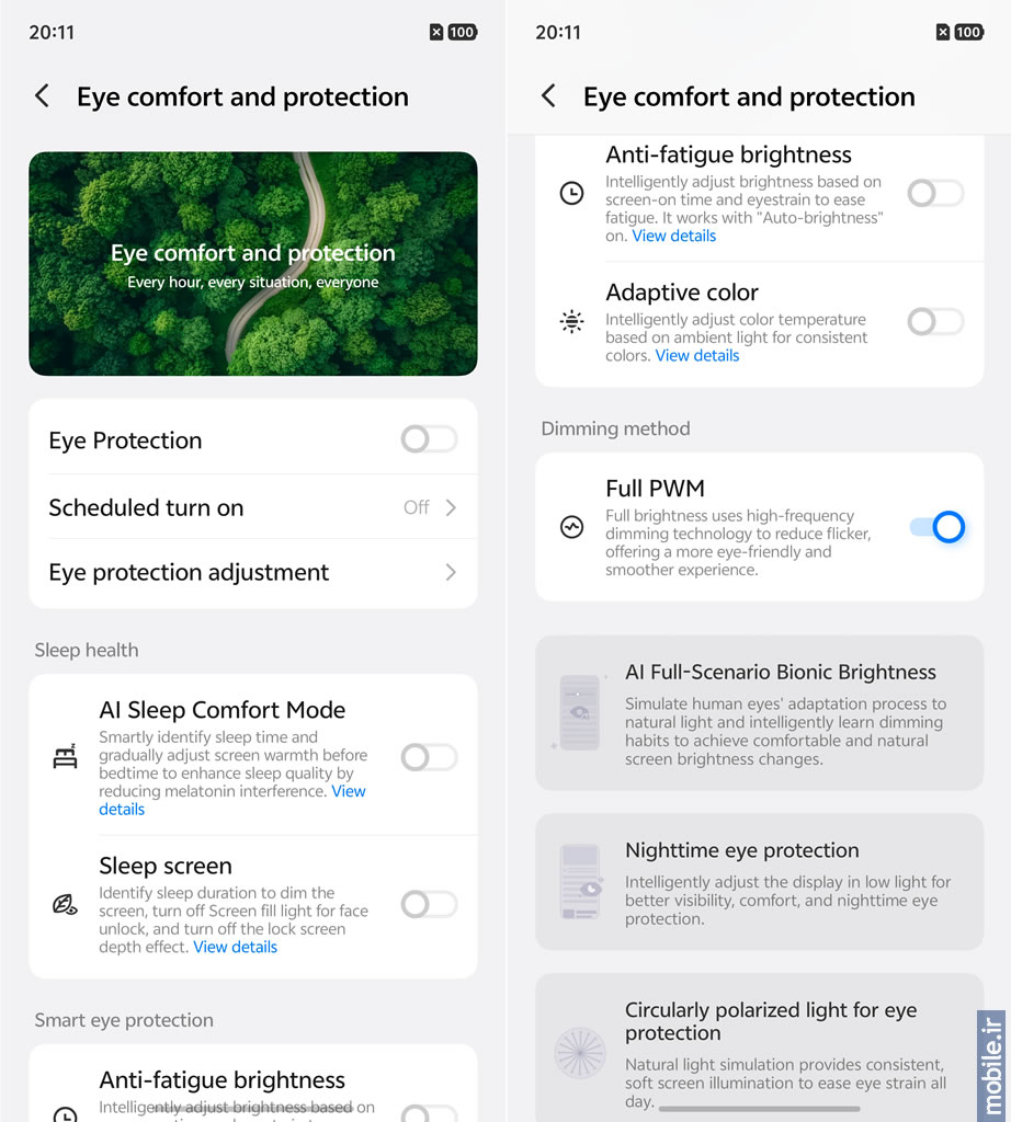 بخش دیگری در رابطه با صفحهنمایش بهنام Eye comfort and protection (راحتی چشم و محافظت) در منوی تنظیمات دیده میشود که از طریق آن بهجز گزینههای معمول و متداول کاهش نور و تعدیل رنگ آبی، مواردی برای تشخیص خودکار زمان خواب و تنظیم متناسب گرمای رنگ، کاهش خستگی چشم با دنبال کردن زمان روشن بودن پنل و تنظیم روشنایی و تنظیم گرمای رنگ برحسب نور محیط ارائه شده است. یکی از گزینههای این بخش Full PWM نام دارد که بهصورت پیشفرض فعال است و در توصیف آن کاهش نور در روشنایی کامل صفحهنمایش با فناوری PWM (خاموش و روشن کردن پیدرپی بکلایت برای ایجاد حس کمتر و بیشتر شدن نور) با فرکانس بالا انجام میشود؛ قابلیتی که ظاهراً با خاموش کردن آن این وظیفه بر عهده فناوری DC dimming (کاهش نور با کمتر کردن ولتاژ تغذیه صفحهنمایش) واگذار میشود.