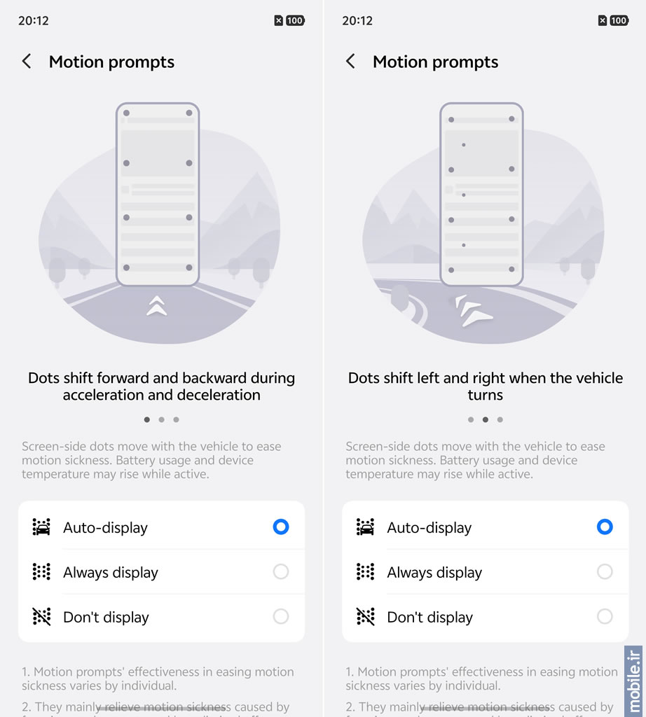 Motion prompts که اولین بار در گوشیهای آیفون ظاهر شد نیز برای X300 Pro در دسترس است و با کمک نقطههای متحرک در دو طرف صفحهنمایش مشکل سرگیجه و تهوع در حین استفاده از گوشی در اتوموبیل در حال حرکت تعدیل میشود.