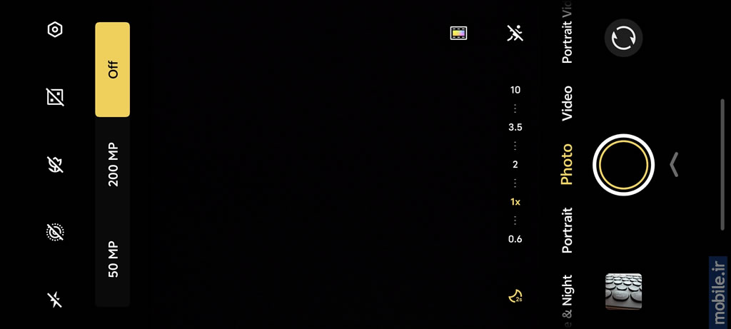 در سوی دیگر این رابط کاربری از بالا به پایین گزینه دسترسی به سایر تنظیمات دوربین، امکان فعال کردن وضوح کامل 50 یا 200 مگاپیکسلی دوربینها، حالت سوپر ماکرو برای گرفتن عکس از فاصله بسیار نزدیک با دوربین تلهفتو، Live Photo برای گرفتن چند ثانیه ویدئو بعد از هر عکس و تنظیمات فلش جای دارند. یک نکته جالب در این میان اتکا به دوربین تلهفتو برای گرفتن عکس از فاصله بسیار نزدیک یا سوپر ماکرو است؛ قابلیتی که معمولاً در حضور فوکوس خودکار دوربین اولتراواید به این دوربین محول میشود.