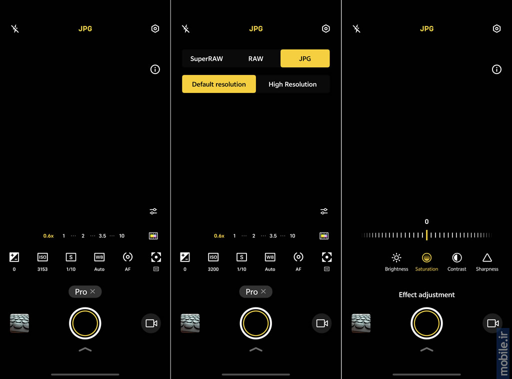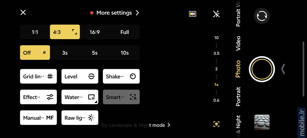 با لمس دکمه Settings از این قسمت چندین گزینه از جمله نسبت تصویر (1:1، 16:9، 4:3 و فولاسکرین)، تایمر عکاسی، نمایش خطوط راهنمای تصویر (Grid lines)، ترازی صافی قاب تصویر (Level)، فوکوس دستی و افکت (برای تنظیم همزمان چهار گزینه روشنایی، اشباع، کنتراست و شارپنس) در دسترس قرار میگیرد که برخی از آنها معمولاً تنها در منوی Pro یا حرفهای دوربین ارائه میشود.