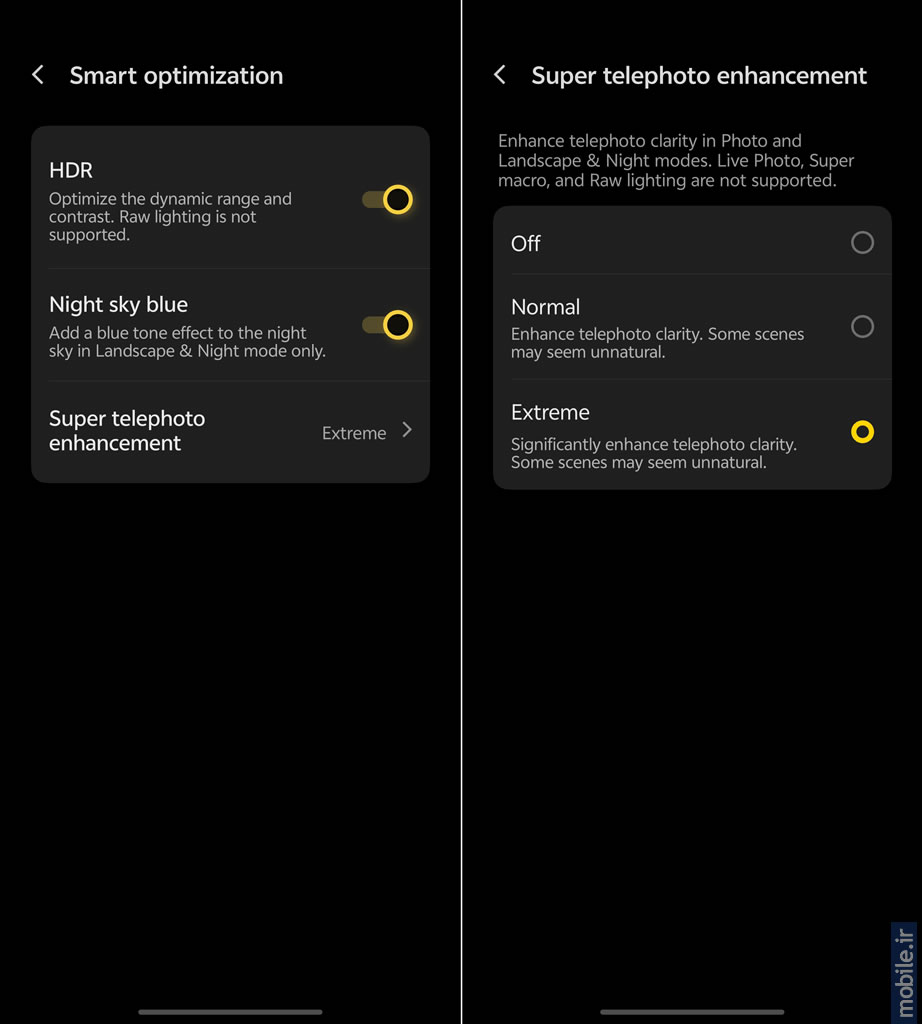 از جمله پیچیدگیهای این منو میتوان به جستوجو برای یافتن گزینه HDR اشاره کرد که برای دسترسی به آن پس از انتخاب گزینه چرخدنده بالای صفحهنمایش باید گزینه More settings و سپس Photo را برگزید و سپس گزینه Smart optmiztion را انتخاب کرد تا گزینه HDR پیش روی شما قرار بگیرد که بهصورت پیشفرض فعال است. در همین منو گزینه دیگری بهنام Super telephoto enhancement دیده میشود که برای واضح کردن عکسهایی که با زوم دیجیتال دوربین تلهفتو برداشت شدهاند در نظر گرفته شده و در حالت پیشفرض روی گزینه Extreme قرار داد و بدینترتیب عکسهای گرفته شده با زوم بالا با پردازش کامپیوتری شدید ارتقاء! پیدا میکنند.