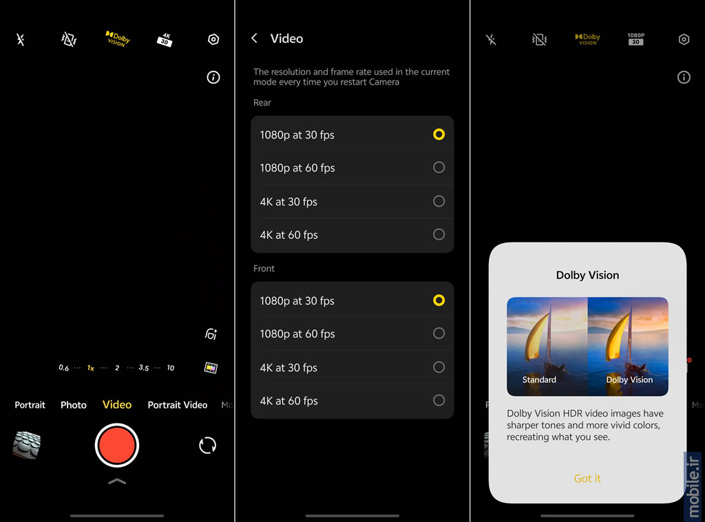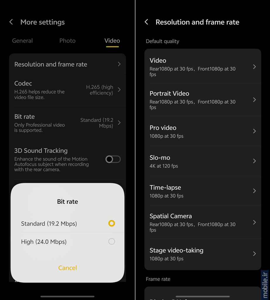 در بخش ویدئو از این منو با گزینههای جالب توجهای روبرو میشویم که از آن جمله میتوان به امکان تغییر بیتریت ویدئو در حالت پرو و امکان انتخاب وضوح پیشفرض برای حالتهای مختلف برداشت ویدئو (حالت عادی، پرتره، حالت حرفهای، اسلوموشن و...) اشاره کرد.