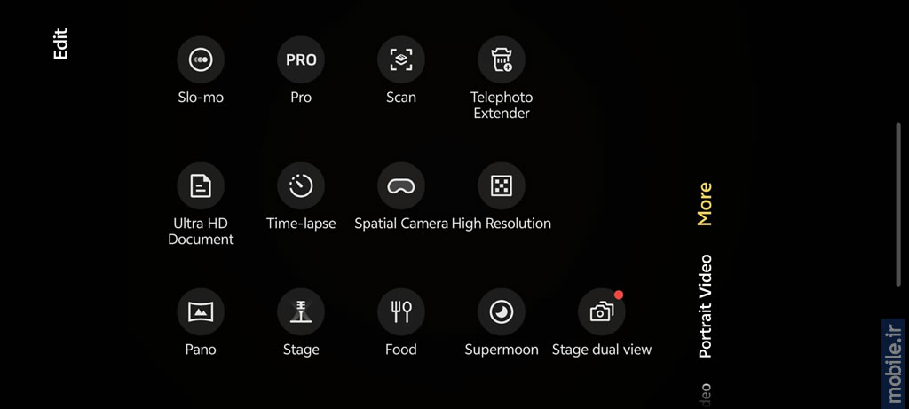 در منوی More گزینههای نامآشنای متعددی مثل تصویربرداری پانوراما، اسلوموشن و تایملپس دیده میشود و برخی گزینههای نسبتاً تزیینی مثل Stage (برای تصویربرداری از کنسرتها و موارد مشابه)، سوپرمون (برای تصویربرداری از ماه) و Spatial Camera (برای گرفتن عکس با زوایای مشخص با ایجاد حس سهبعدی برای استفاده در عینکهای واقعیت مجازی) نیز در آن حضور دارد.