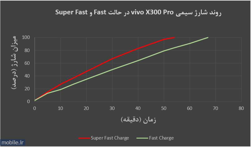 X300 Pro همانطور که اشاره شد از شارژ سیمی سریع 90 واتی پشتیبانی کرده و این شارژر خوشبختانه درون جعبه دستگاه (تنها در نسخه چین) نیز حضور دارد. با اتصال شارژر به گوشی دو گزینه Fast Charge و Super Fast Charge روی صفحه ظاهر میشود که اولی بهصورت پیشفرض انتخاب شده و ظاهراً برای رسیدن به سرعت بالاتر باید Super Fast Charge را انتخاب کرد. تست باتری را طبق معمول از شارژ 2 درصد آغاز میکنیم و گوشی بهصورت روشن تست شده است. در حالت سوپر فست شارژ باتری پس از گذشت 5، 10 و 15 دقیقه بهترتیب به 15، 27 و 37 درصد رسید و پس از 22 دقیقه 50 درصد آن پر شد. گوشی پس از 30 دقیقه به شارژ 67 درصد و پس از 50 دقیقه به شارژ 97 درصد رسید. شارژ کامل نیز پس از 54 دقیقه رخ داد. با انتخاب گزینه پیشفرض Fast Charge شارژ باتری پس از 5، 10 و 15 دقیقه بهترتیب به 13، 19 و 27 درصد رسید که 10 درصد کمتر از حالت سوپر فست شارژ بود. پوشی پس از 30 دقیقه به شارژ 50 درصد رسید و پس از یک ساعت نیز تا 91 درصد شارژ شد. در نهایت شارژ گوشی در این حالت پس از گذشت 67 دقیقه یعنی 13 دقیقه دیرتر از حالت سوپر فست تکمیل شد.